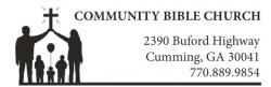 CBC is a non-denominational Bible church consisting of 35-40 families. The church’s meeting place is located on 6.5 acres in Cumming, Georgia. We are 50 miles north of Atlanta Hartsfield-Jackson Airport, 4 miles from Lake Lanier, and 46 miles from Springer Mountain, the southern entrance to the Appalachian Trail. Please visit the websites below for more information on CBC and the surrounding area: