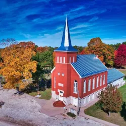 Bluff Hall Church is located in Fall creek Township in Adams County, Illinois ten miles South of Quincy, Illinois, five miles West of Payson, Illinois and seven miles North of Hannibal, Missouri. In spring of 1840 German Settlers moved into area. Then in 1860 a missionary doctor, Dr. Charles Conrad, leading a group of 18 people formed the church on December 3rd. Those who founded the church were of Lutheran and Evangelical traditions, which led the church to be given name, Evangelical Zion Church of Fall Creek. The preaching was in German language served by The Reverend Dr. Conrad until 1894. This was the original stone building. But then in 1894, it was decided that should build a new church building to facilitate the spiritual growth of future generations. Within two years period the present church was erected. The rounded stained-glass windows remain as beautiful today as when installed.